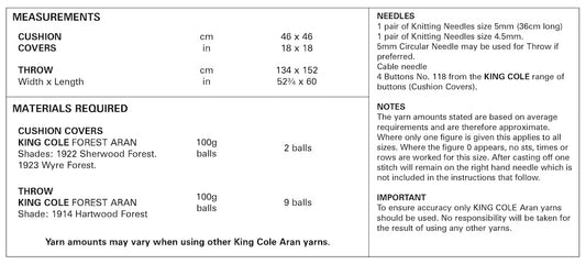King Cole Forest Aran Pattern 5661 Throw & Cushion Covers
