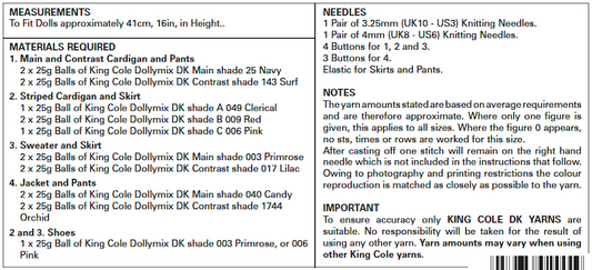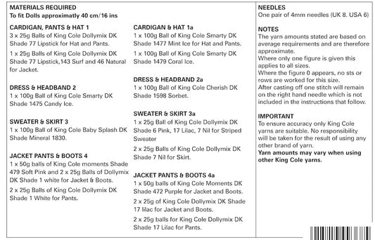 King Cole Pattern No. 4000 Dolls Clothes (DK)