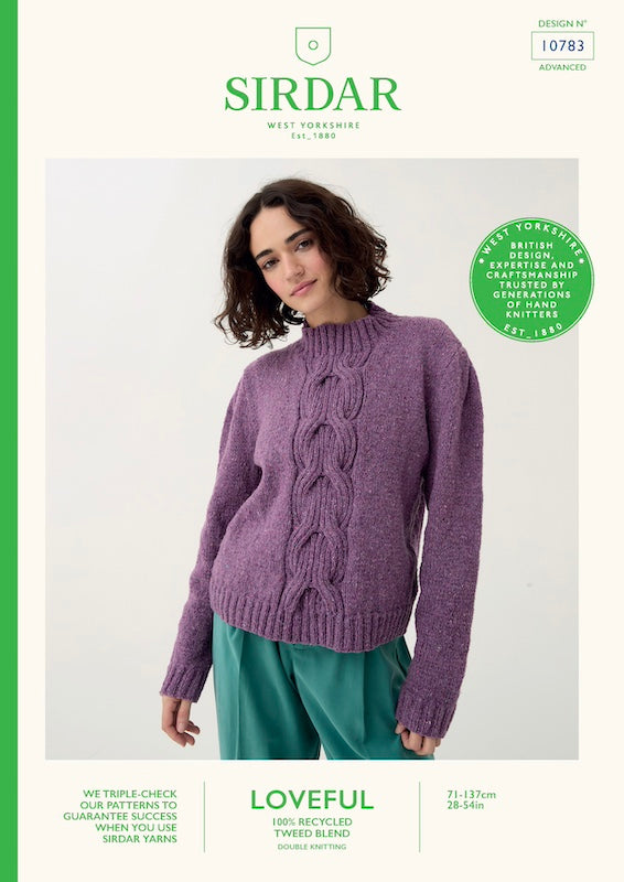 Pleats at the shoulders add volume to the sleeves which finish in the same rib. Designed for you to knit in a striking shade of Sirdar Loveful 100% Recycled Tweed Blend.